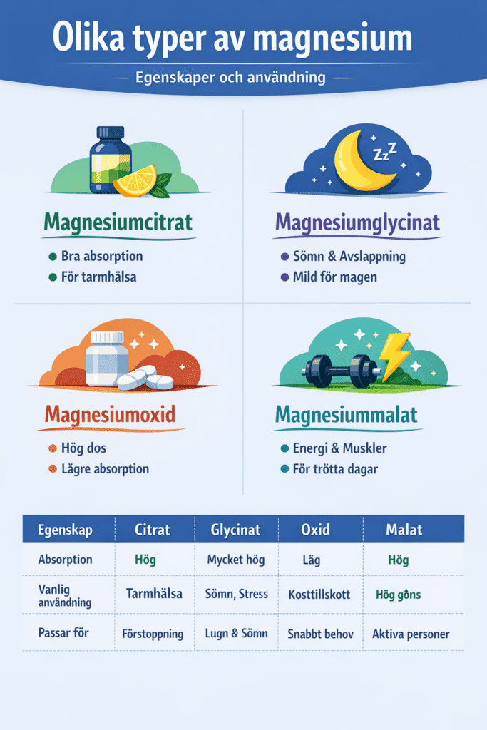 Att känna till olika typer av magnesium, som citrat, glycinat, oxid och malat, hjälper dig att välja det som passar bäst för dina behov. Citrat och malat är bra för muskler och energi, glycinat för sömn och avslappning, medan oxid är ett kostnadseffektivt alternativ.